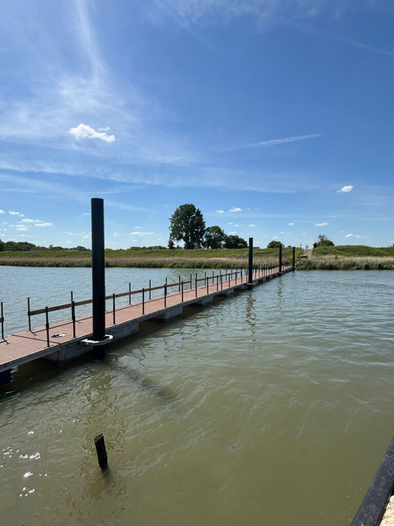 De eerste klus werd succesvol uitgevoerd in Hagestein, waar deze dekschuit in combinatie met de Hitachi KH-180 werd ingezet. Door middel van een trilblok hebben wij voor W2 support de palen aangebracht voor de realisatie van een drijvend looppad.